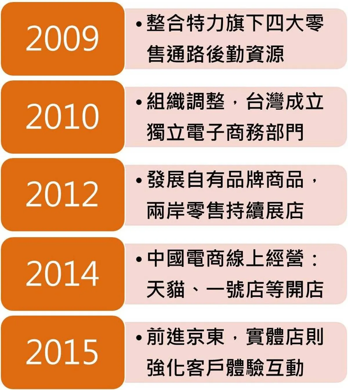 我們台灣官網上的銷售比在 momo 和 PChome 高很多,因為品牌比較被大家認識。但是,大陸的電商環境跟台灣不一樣,被幾個巨頭把持,自己的網站很難有流量,電商營收並不多,所以特力在 2014 年前進大陸的天貓、一號店,去年也進到京東商城,後來比較集中火力在天貓。我們在大陸的線上銷售占 3%,希望在三年內提升到 6%,建置 40 到 50 人的電商跟 IT 團隊,讓他們全權發揮,跟實體做劃分。在大陸的實體零售很苦,原因是商圈變化過大,所以零售業要進入大陸市場真的要審慎!