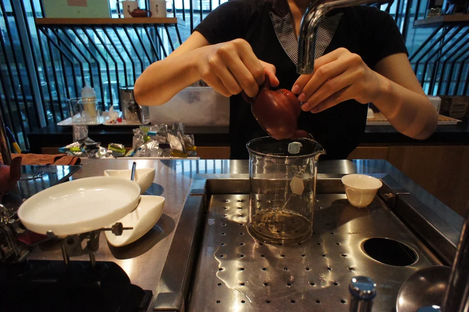京盛宇像謙卑的孩子,用感念的心像台灣茶及台灣這片土地致敬。林昱丞笑說自己也曾是多家百年茶行的死忠粉絲,品茶經驗告訴他,真正重要的事只有一個,就是「好不好喝」,所以「京盛宇」裡頭,發生的所有事情,從堅持用紫砂壺沖泡,到原創式的滴壺及實驗室般的天秤、燒杯、漏斗,都和好喝緊緊相扣。紫砂壺用高溫高壓喚醒蜷曲成團的茶葉,散發最多精華;天秤、燒杯、漏斗用最謙卑恭敬的心情,計量茶葉,只為成就一杯好茶。